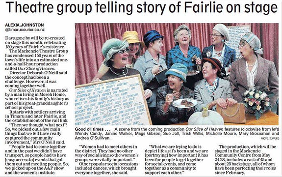 An enlightening and entertaining view of life as it was, including many Fairlie identities and icons through the years. The story is held together by a family story: Pop, who resides in Moreh (the local retirement home) relives his memories through his great-granddaughter's school project on the 150 Year history of Fairlie. With a cast and crew of almost 60 people, and including archive video footage and fabulous old time songs, this is a show not to be missed!